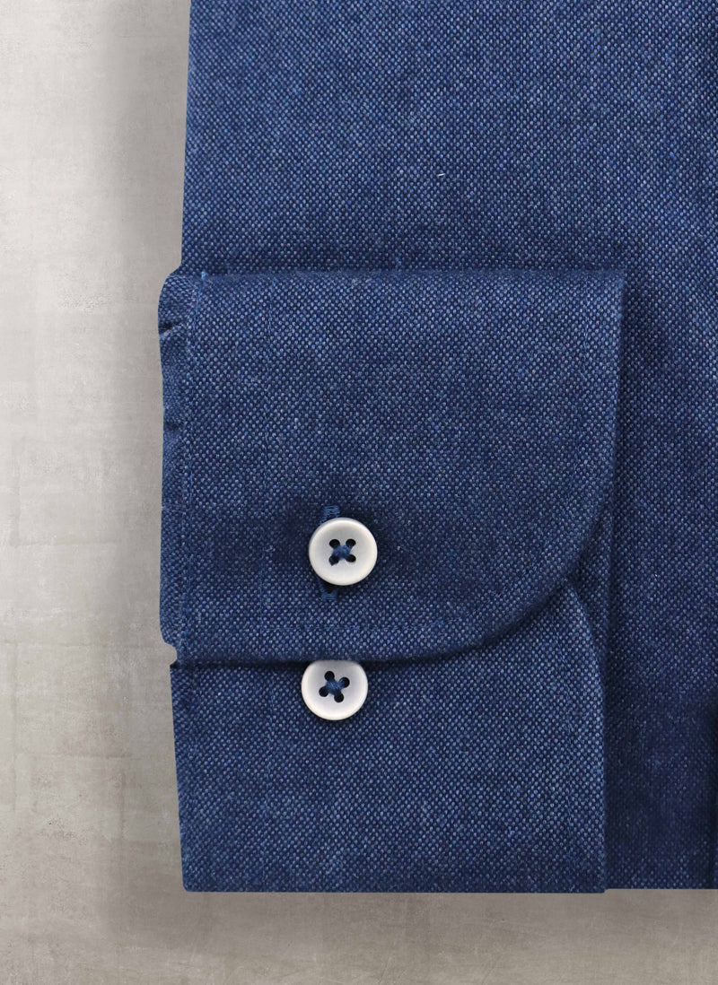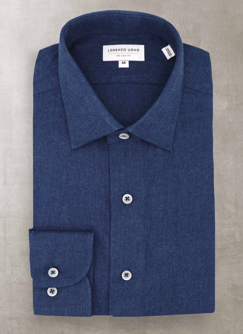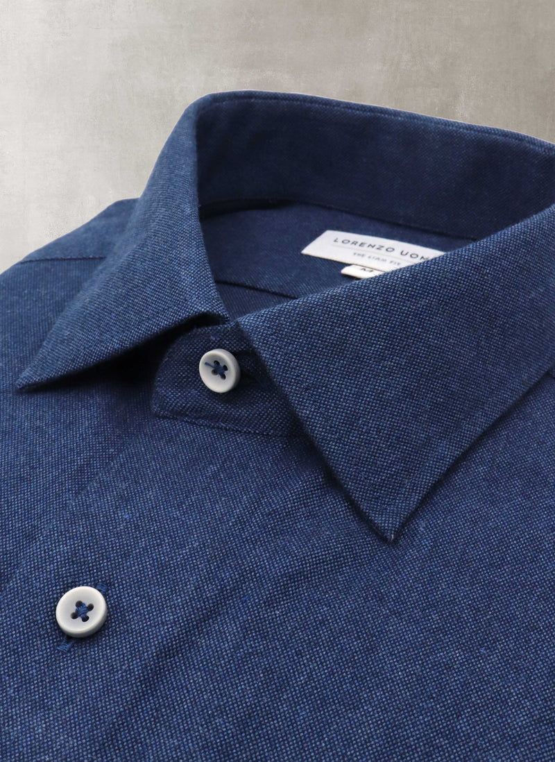 A sophisticated and most decadent choice for fall and winter: our Liam Cashmere Sport in Textured Navy, with a super-soft hand and a dreamy, feathery touch.  This ultra-luxurious shirt is crafted from the most luxurious cashmere and cotton yarns.  The rich, denim color is augmented by the subtle, nuanced texture of the fabric as well as the intentional contrasts of the buttons.  May be equally worn under a sportcoat or paired with chinos or cords as an overshirt.