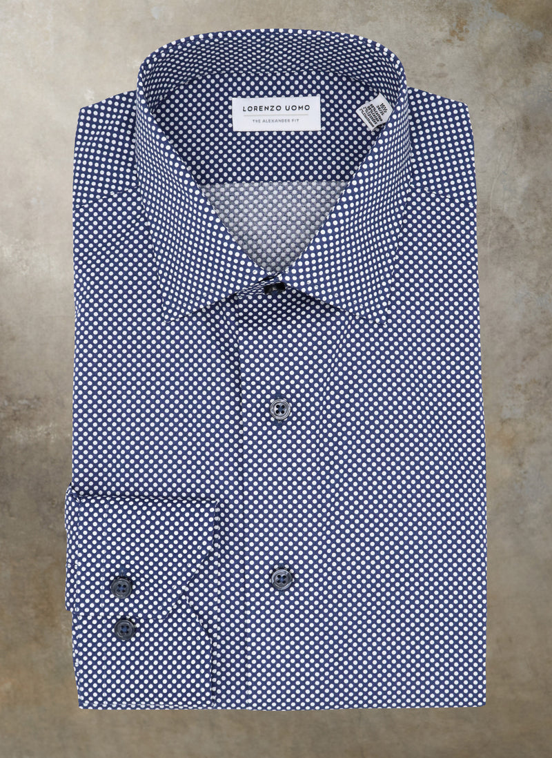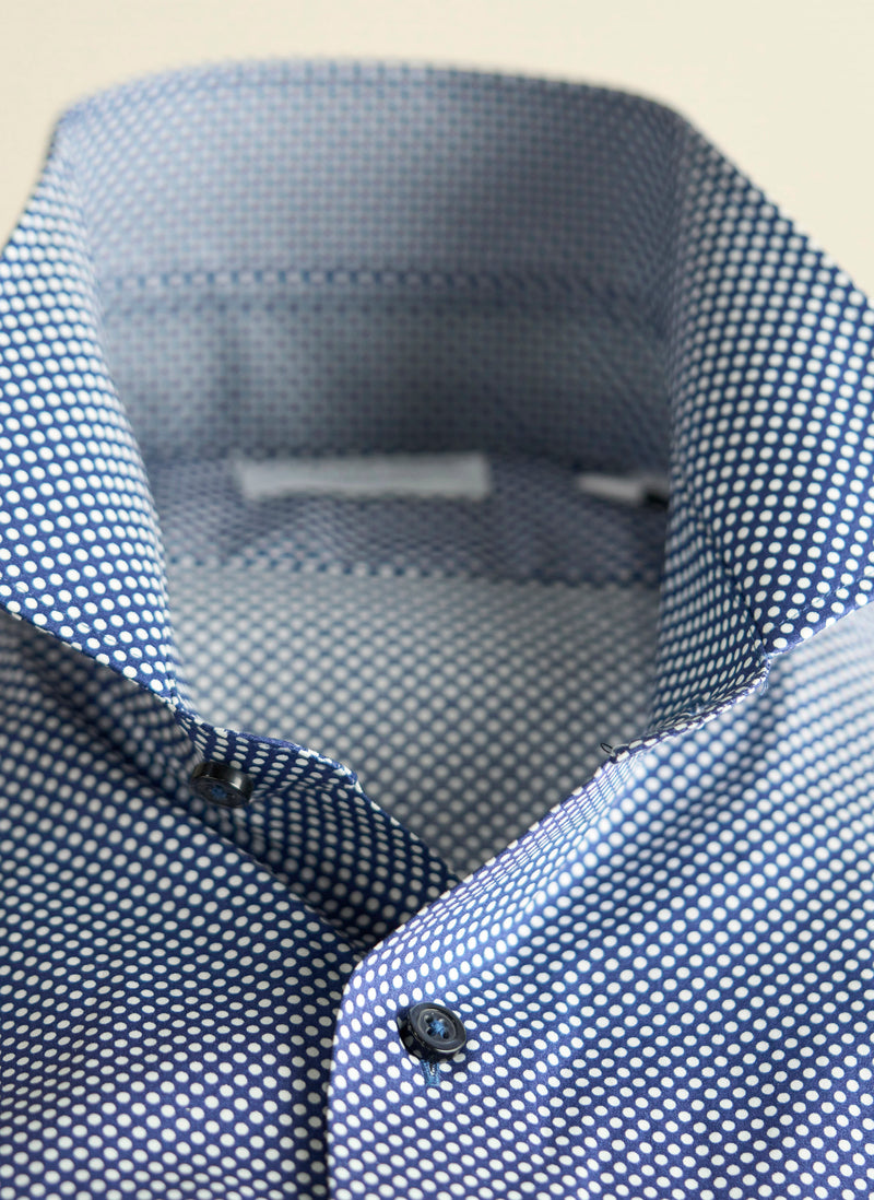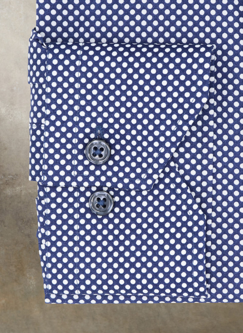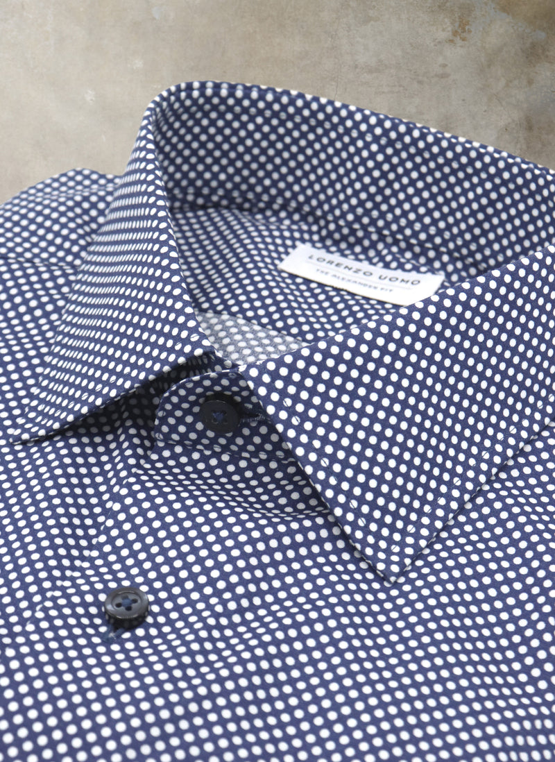 Alexander in Navy Dots, one of the most fulfilling and gratifying styles we’ve worked on: the dot pattern seems simple enough, however it took nearly a year for this to pass our discriminating design standards: it took multiple tries to achieve the desired clarity of definition of the white dots on the navy ground. We experimented with different combinations of base fabrics and printing methods. We finally found the perfect formula, where the crispness of the white truly shines on a fabric worthy of this rich and refined pattern. The result: a playful, yet highly upscale shirt that can be worn either day or night. Super-elegant when paired with a navy blazer.