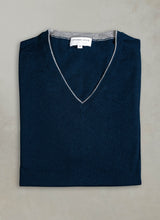 Indulge in our buttery-soft Cashmere/Extrafine Extra Lightweight Merino V-neck sweaters. Made with 2 twisted plies of the finest blended yarn, this garment is extremely versatile--perfect for wearing under a sportcoat--without any constraint in motion--or simply wear outdoors in fall or spring. This light garment features thoughtful details throughout, such as a 1/8” contrast at the inside edge of the collars and at the tip of the wrists.