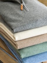Indulge in our buttery-soft Cashmere/Extrafine Merino Quarter-Zip sweaters, the staple to any wardrobe. Made employing 2 twisted plies of the plushest blended cashmere yarn, our quarter-zip sweater features elegant contrast detailing throughout the garment as well as the highest quality zipper and faux leather stitched pull.