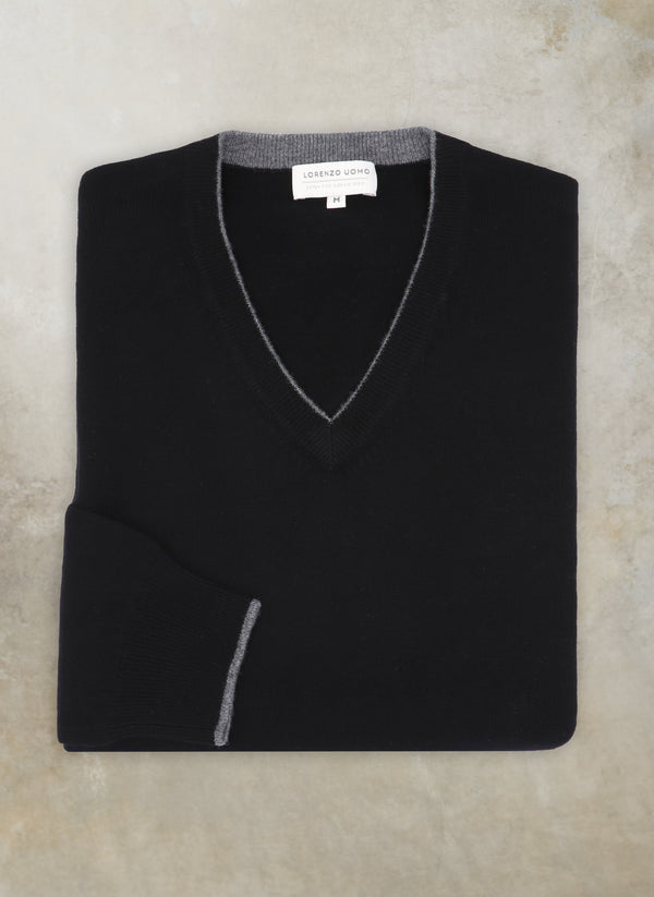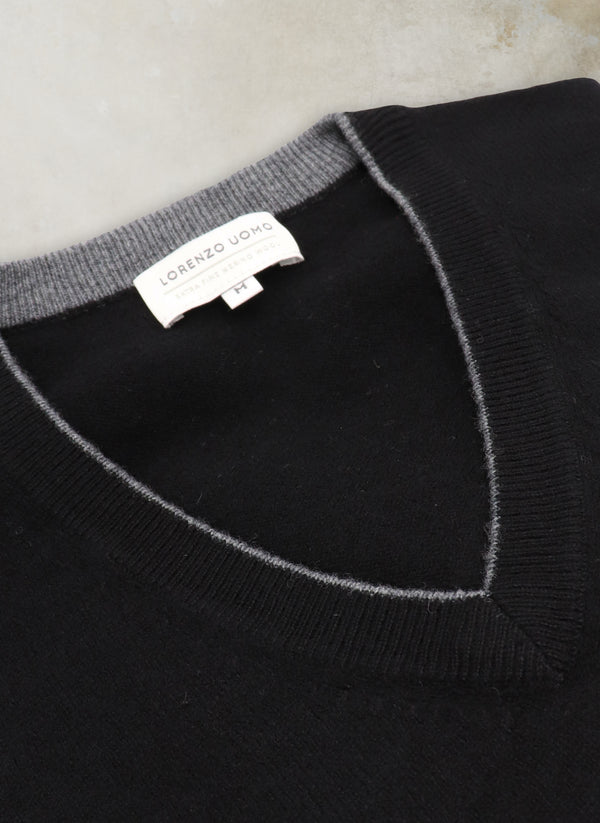 Men's Melbourne Contrast V-Neck Extra-Fine Pure Merino Wool Sweater in Black