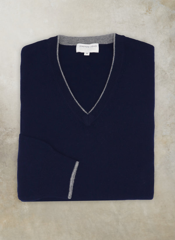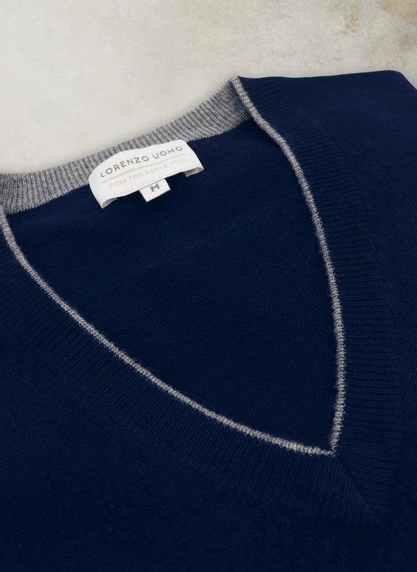 Men's Melbourne Contrast V-Neck Extra-Fine Pure Merino Wool Sweater in Navy