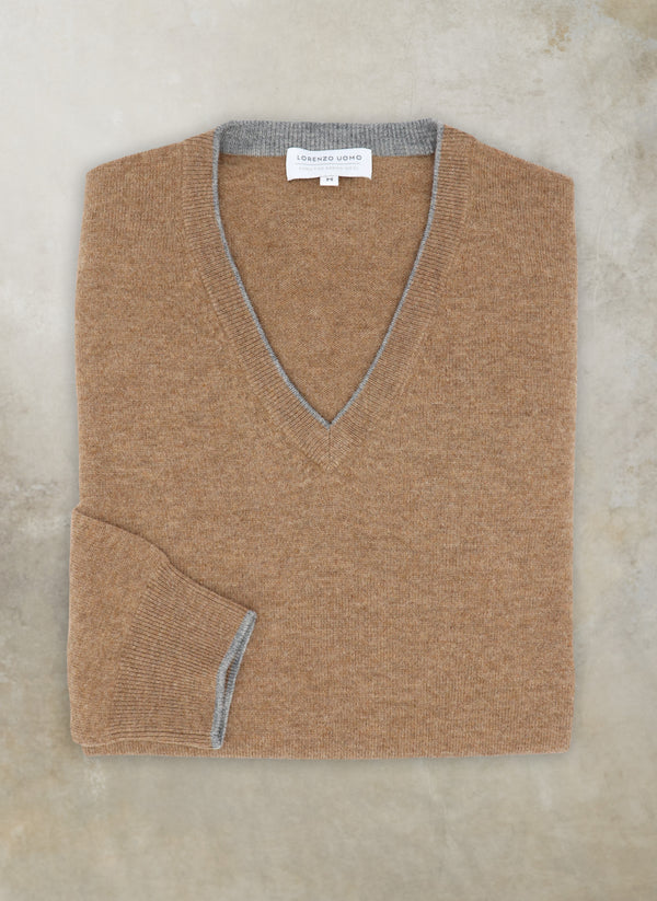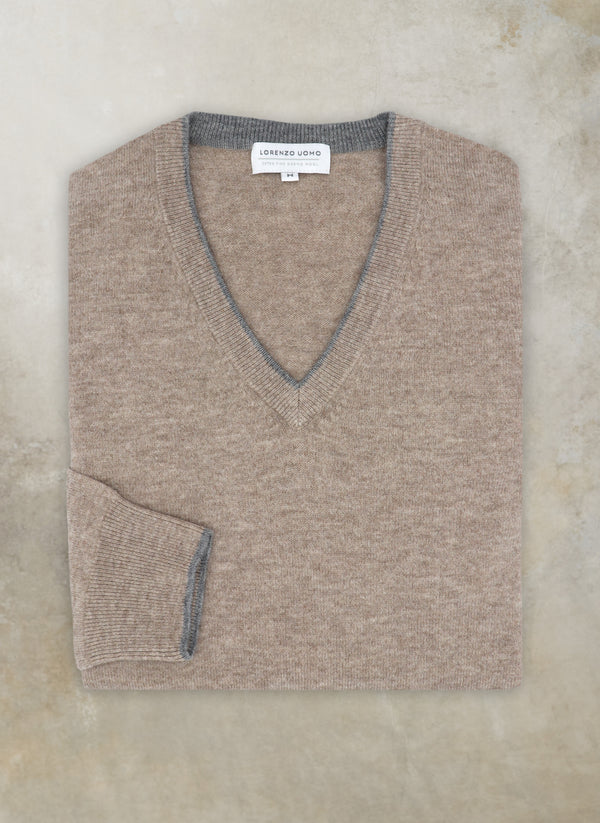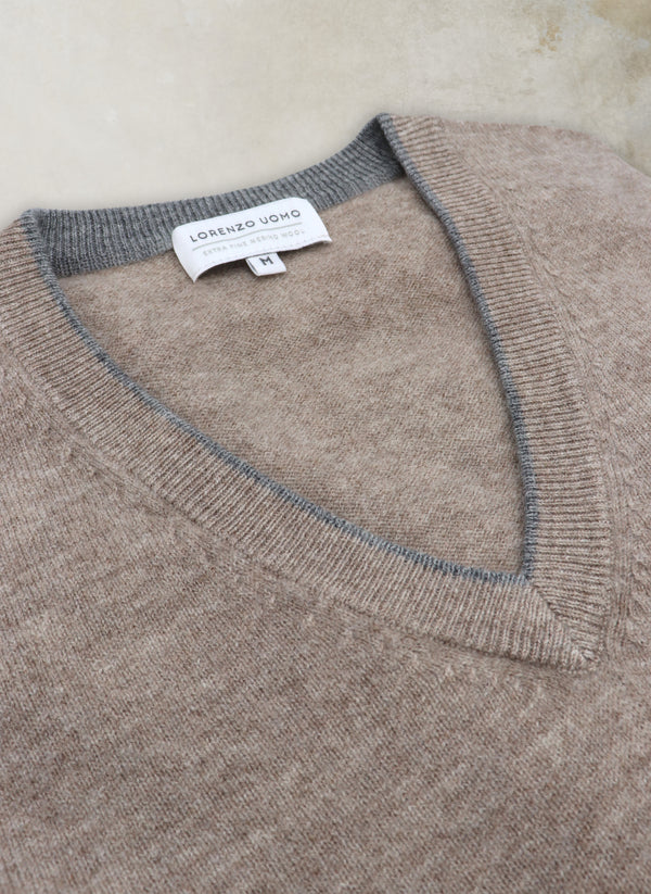 Men's Melbourne Contrast V-Neck Extra-Fine Pure Merino Wool Sweater in Taupe