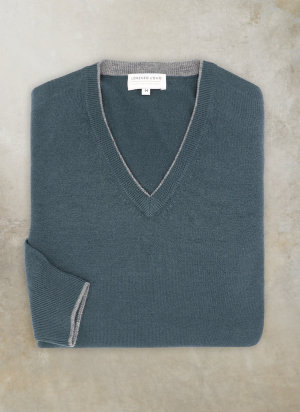 Men's Melbourne Contrast V-Neck Extra-Fine Pure Merino Wool Sweater in Teal