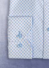 From our Portofino Print collection, our Alexander in Printed Blue "Testazzuro" Shirt is expertly and indelibly printed with a subtle and unique broken-diamond pattern, woven and executed by master craftsmen in Austria. Sporting dreamy, light blue buttons, the result is subtle and highly elegant. Can be worn equally at ease during the day or at night. Can be worn dressed up with a Navy blazer.