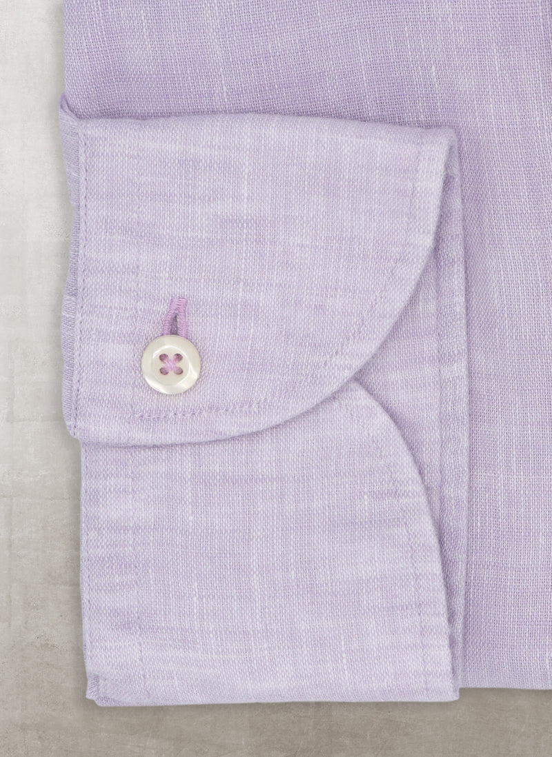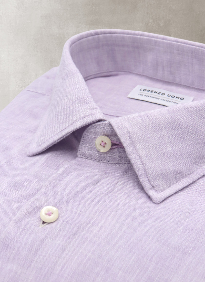 Inspired by the effortless style worn in Portofino, the Alexander in Purple Linen is a must-have of any wardrobe. Crafted of super soft linen fabric, it exudes effortless style when worn untucked. The pale blue stitching on the top collar button and cuffs adds a polished finishing touch. Worn under a suit and with a tie, the shirt exudes casual ease. The Alexander is the trimmest of all our fits, calibrated to accentuate a lean, athletic body type.