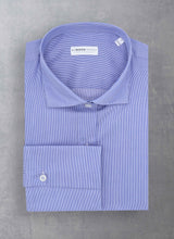Introducing our classic Blue Mini Stripe shirt, one of our most versatile and elegant pieces. Wear it as you would a white shirt, as it matches almost everything. Crafted from the softest, pure 2-ply cotton, the hand is simply blissful. Featuring a hairline stripe against a light blue background, this elegant piece is adorned with soft blue contrast stitching at the buttons as well as with our signature, fully-fashioned European flare cuffs. Can be easily dressed up or down.