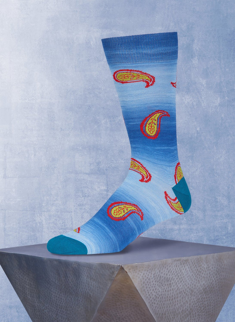 A traditional pattern with a modern twist. Retro paisley is superimposed on a space dyed exclusive ground.