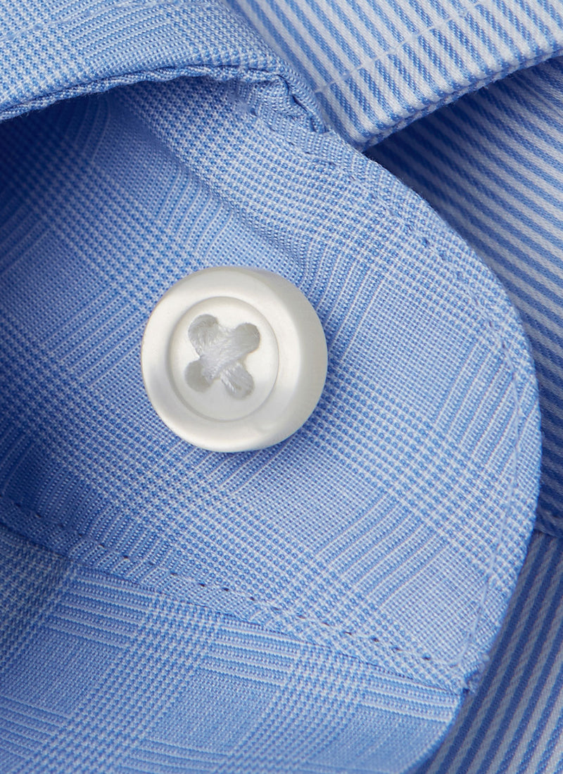 The Liam in Blue Glen Plaid shirt is crafted of ultra fine fibers, which is extremely expensive to produce, and is usually only found in Italian shirts selling for over $300. The result is a lightness and airiness upon the skin, luxurious to the touch—an extremely “silky” hand.