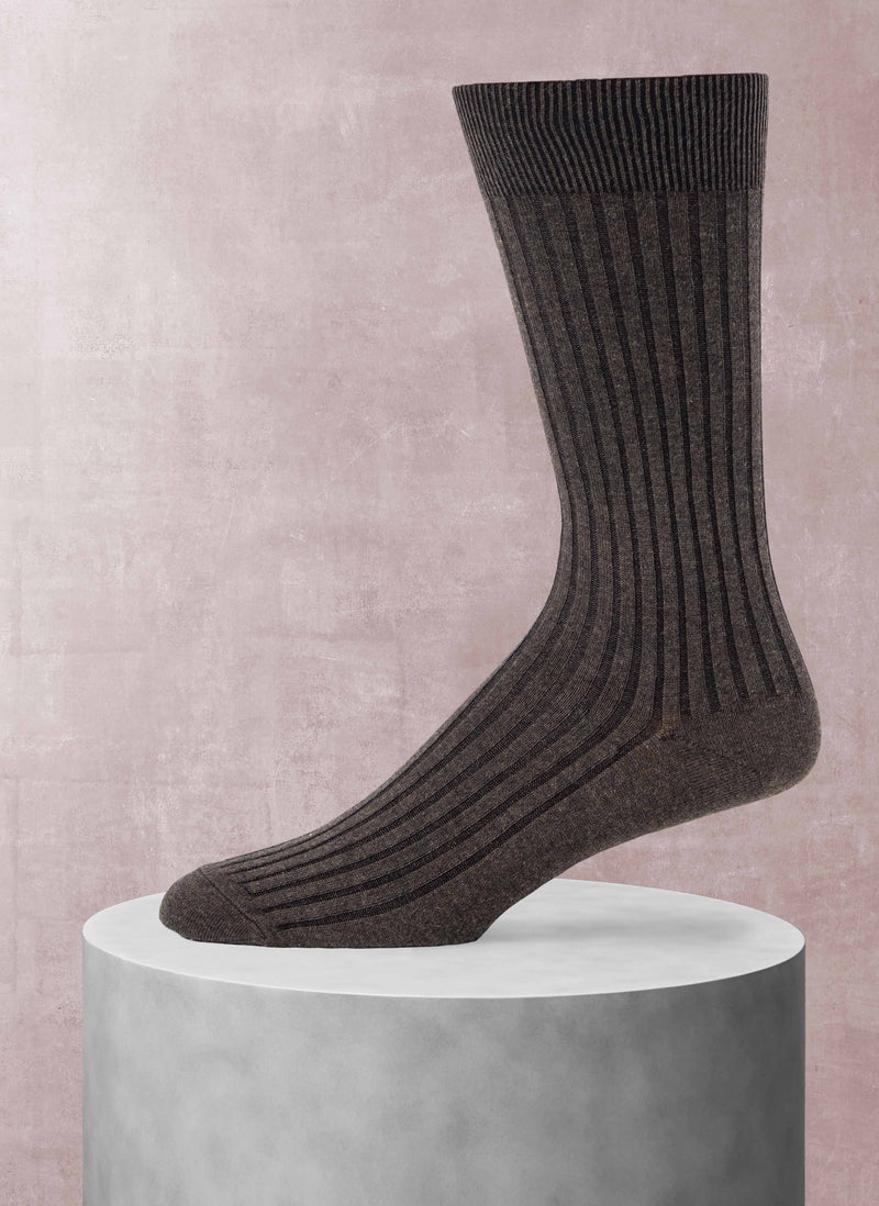 Our Short Ribbed Egyptian Cotton sock has a unique, sartorial 5x3 rib construction, which results in truly elegant contours when worn. The base yarn is of extra-long staple raw yarn, which is extraordinarily luxurious. The ultimate sock to wear in a boardroom setting. Made in Italy.