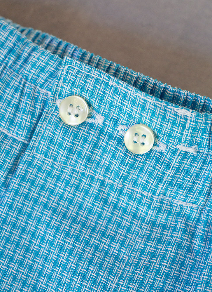 Our boxer features bespoke details found only in exclusive custom-made boxers. There are two operable buttons at the waist, as well as a functional fly opening. The waistband elastic is fully covered with pleated fabric running the length of the waist, further enhancing comfort by eliminating skin contact with elastic.