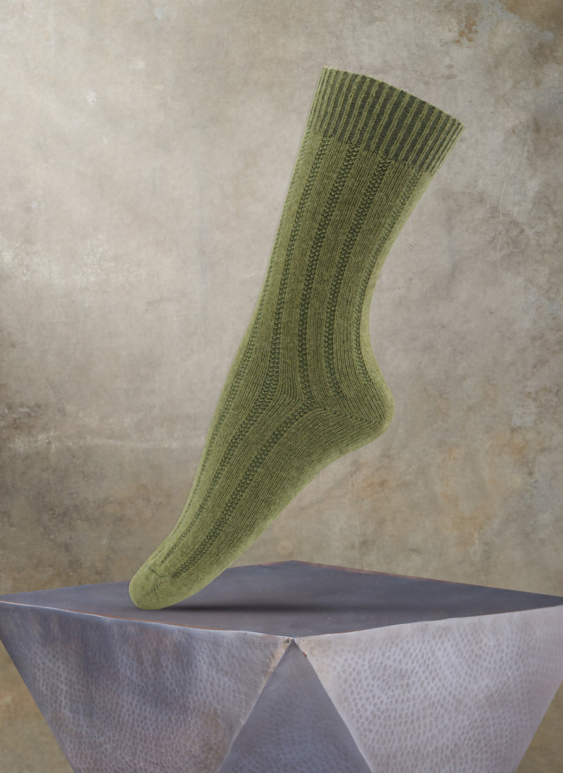 To achieve a luxurious yet durable sock, our Italian yarn spinner developed a unique yarn blended with raw cashmere, viscose and nylon. The result is a sock that takes much extended wear while keeping your feet cushioned in sumptuous softness.